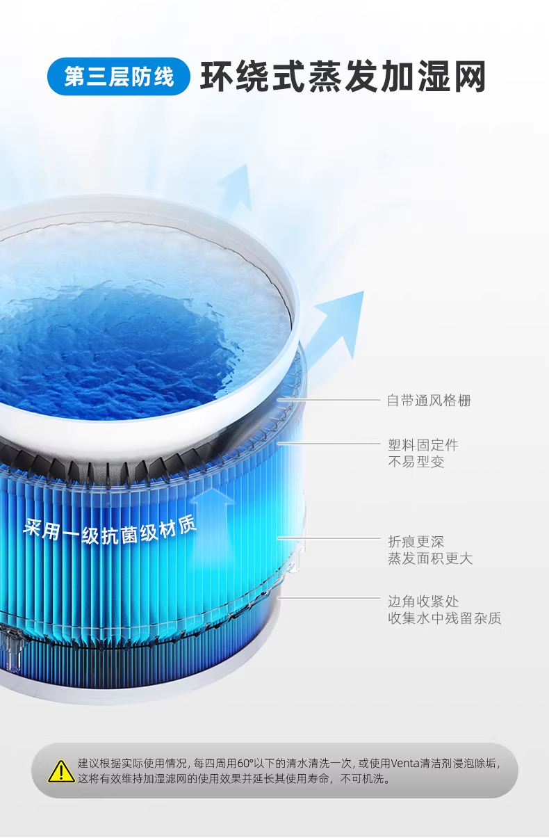 第三層:環繞式蒸發加濕網采用一級抗菌級材質打造,深折痕設計大幅擴大蒸發面積,邊角收緊結構可高效收集水中殘留雜質。搭配內置 UV 燈的雙重防護,進一步減少細菌殘留,讓加濕過程的水質始終保持純凈,釋放健康濕潤的空氣。
