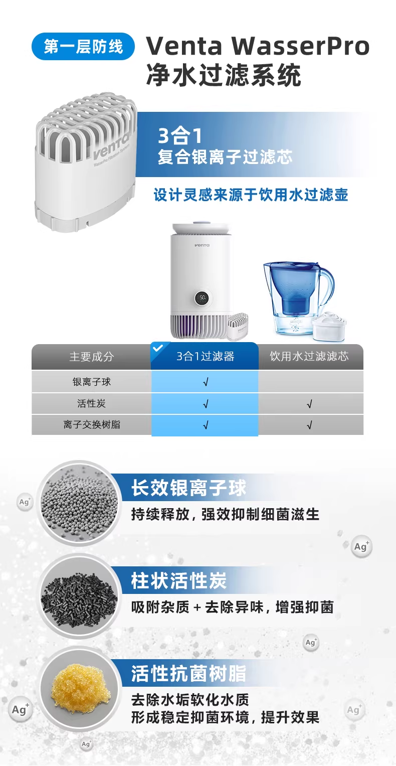 第一層:WasserPro 凈水過濾系統作為水質凈化的第一道防線,該系統采用靈感源自飲用水過濾壺的 3 合 1 復合銀離子濾芯,集銀離子球、柱狀活性炭、活性抗菌樹脂三大核心功能于一體。銀離子球持續抑制細菌滋生,柱狀活性炭強力吸附水中雜質與異味,活性抗菌樹脂有效去除水垢并軟化水質,從源頭保障水箱長久潔凈無殘留。