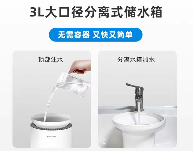 3L 大口徑分離式儲水箱配備兩種靈活加水方式,兼顧便捷性與實用性:頂部注水采用大口徑漏斗式設計,無需關機即可加水,有效防止溢水;分離水箱加水無需額外容器,無論設備處于關機或運行狀態,均可隨時取下加水,實現即插即用。對比同類產品,操作更靈活、效率更高。