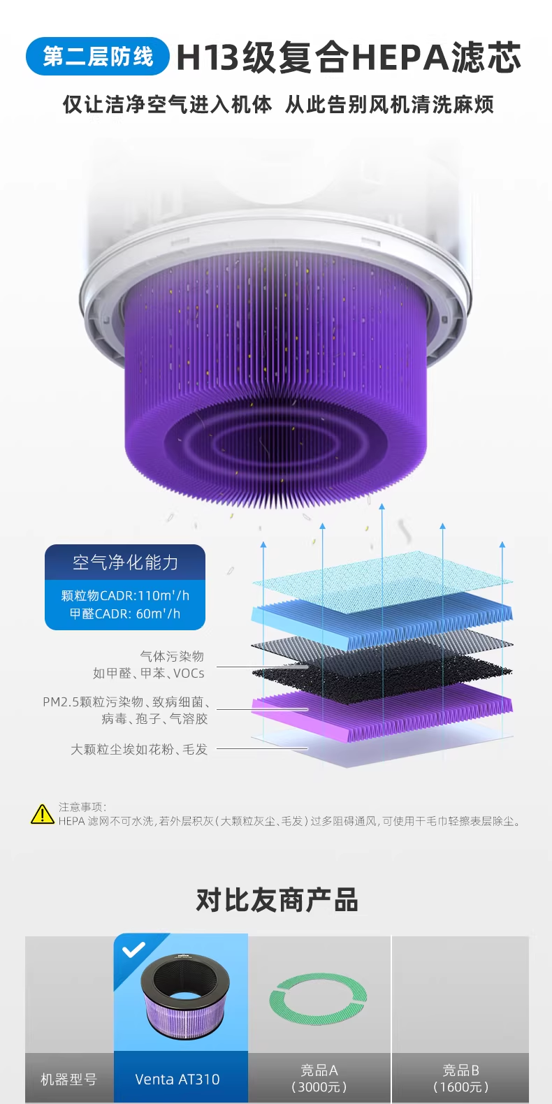 第二層:H13 級復合 HEPA 濾芯聚焦空氣凈化的關鍵環節,H13 級復合 HEPA 濾芯可高效過濾空氣中的顆粒物、氣態污染物、致病菌等有害雜質,既確保進入機體的空氣潔凈度,又能避免風機積塵,實現風機免清洗的便捷體驗。其顆粒物 CADR 值達 110m3/h、甲醛 CADR 值達 60m3/h,完全滿足日常室內空氣凈化需求。